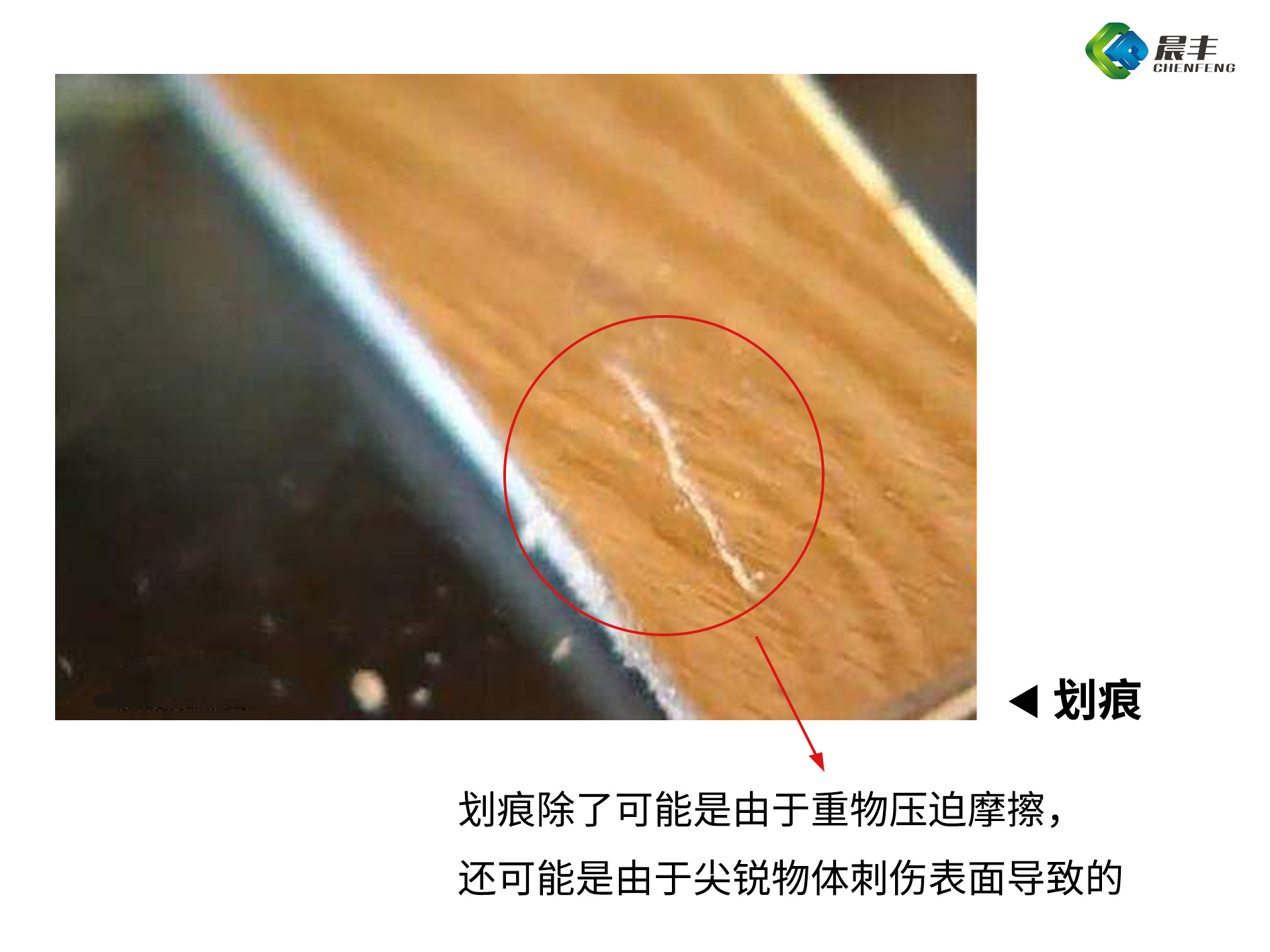 划痕与压痕现象的不同之处在于,划痕除了可能是由于重物压迫摩擦,还可能是由于尖锐物体刺伤表面导致的。划痕如果不算严重的话,一般不会成为导致板材断裂的“元凶”,只是在使用到一定时间过后,可能会因为表面暴露而损伤材料和出现脏污沾染严重的情况。