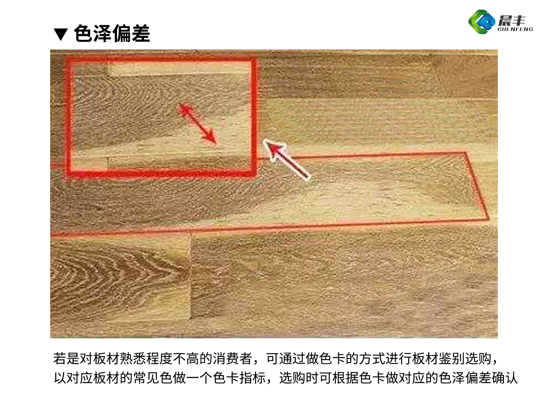 因此,若是对板材熟悉程度不高的消费者,可通过做色卡的方式进行板材鉴别选购,以对应板材的常见色做一个色卡指标,选购时可根据色卡做对应的色泽偏差确认。