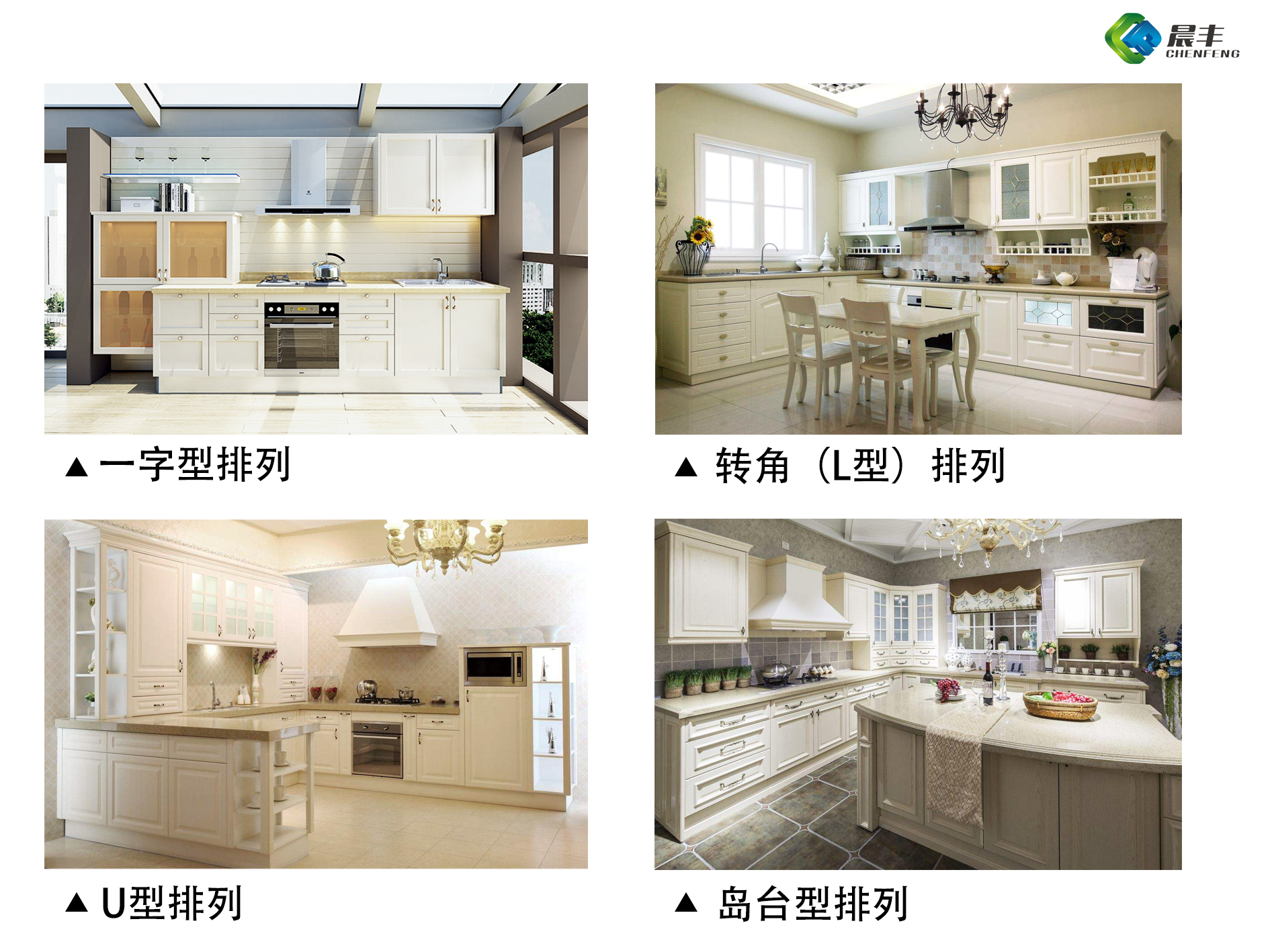 小空间家庭——一字型排列;面积中等家庭——转角(L型)排列;空间充足家庭——U型排列;使用厨房人数较多家庭——岛台型排列。