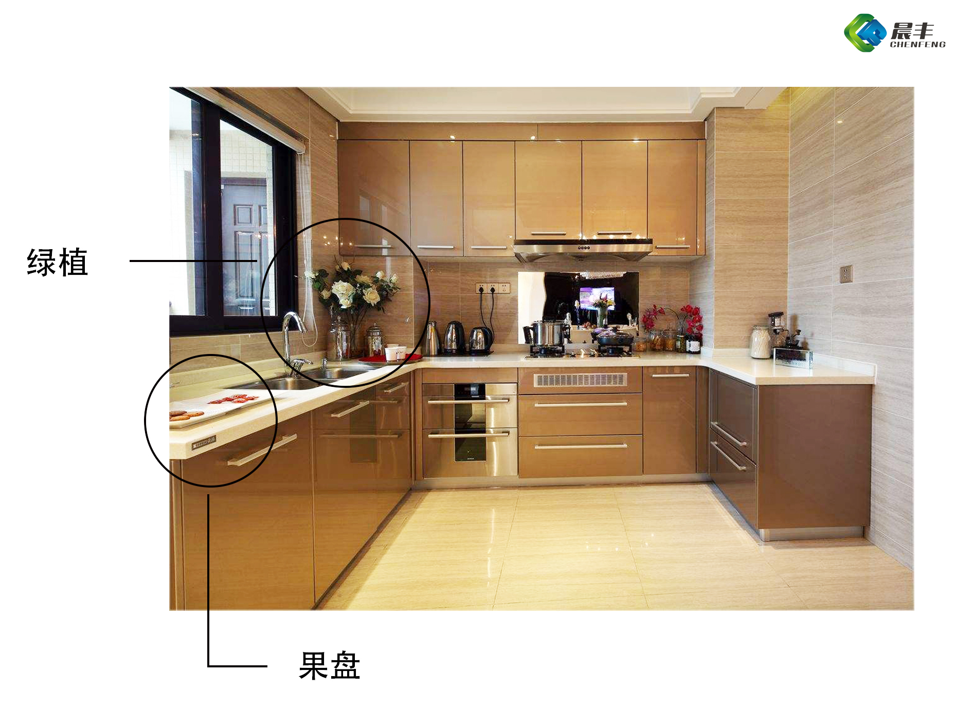 其中位置归整是为了迎合橱柜摆放空间,让台面看起来整洁有条理;装饰品一般为小绿植或与厨房相关的饰物,是为了使台面更具有设计观感;加装物则是为了使台面在使用时更方便安全,增加使用寿命等。