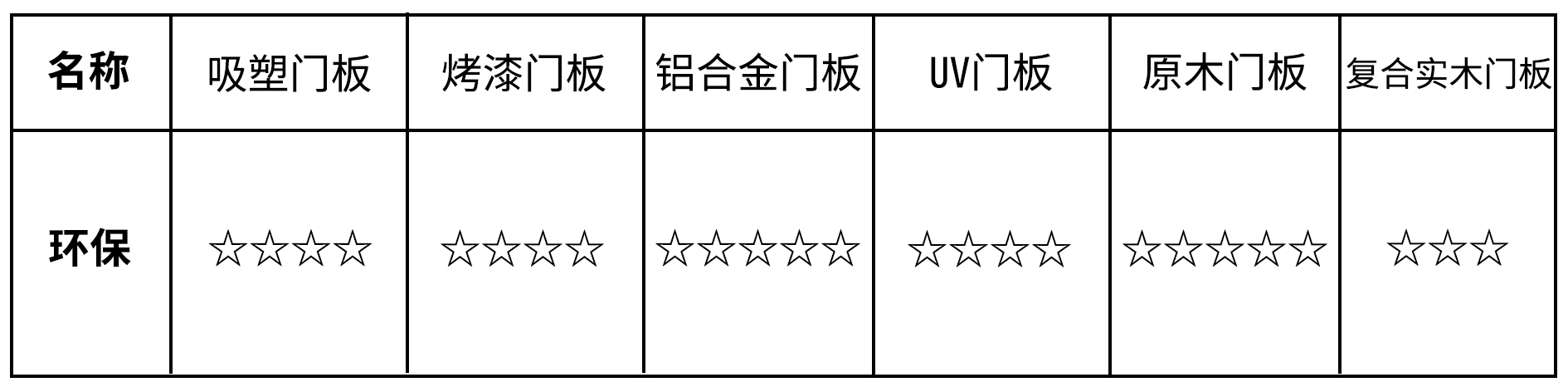 环保选购排行榜:原木门板>铝合金门板>烤漆门板>UV门板>复合实木门板>吸塑门板